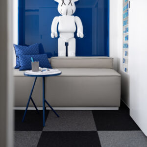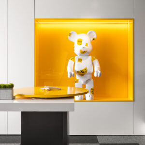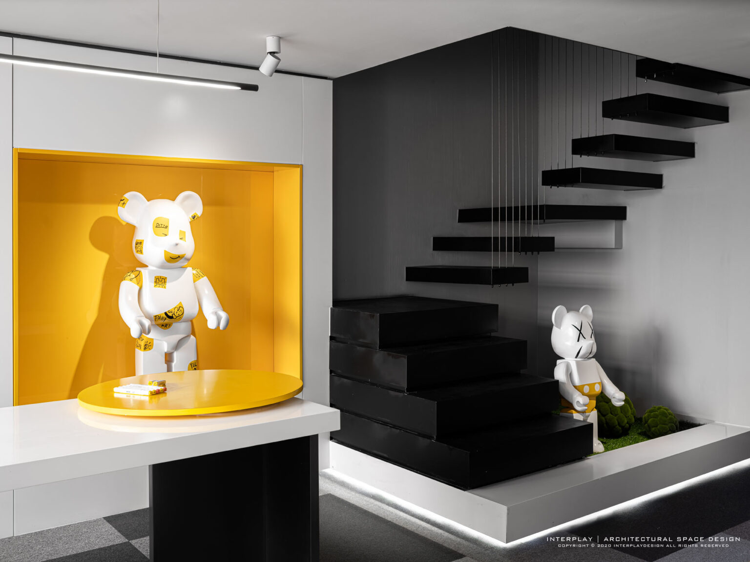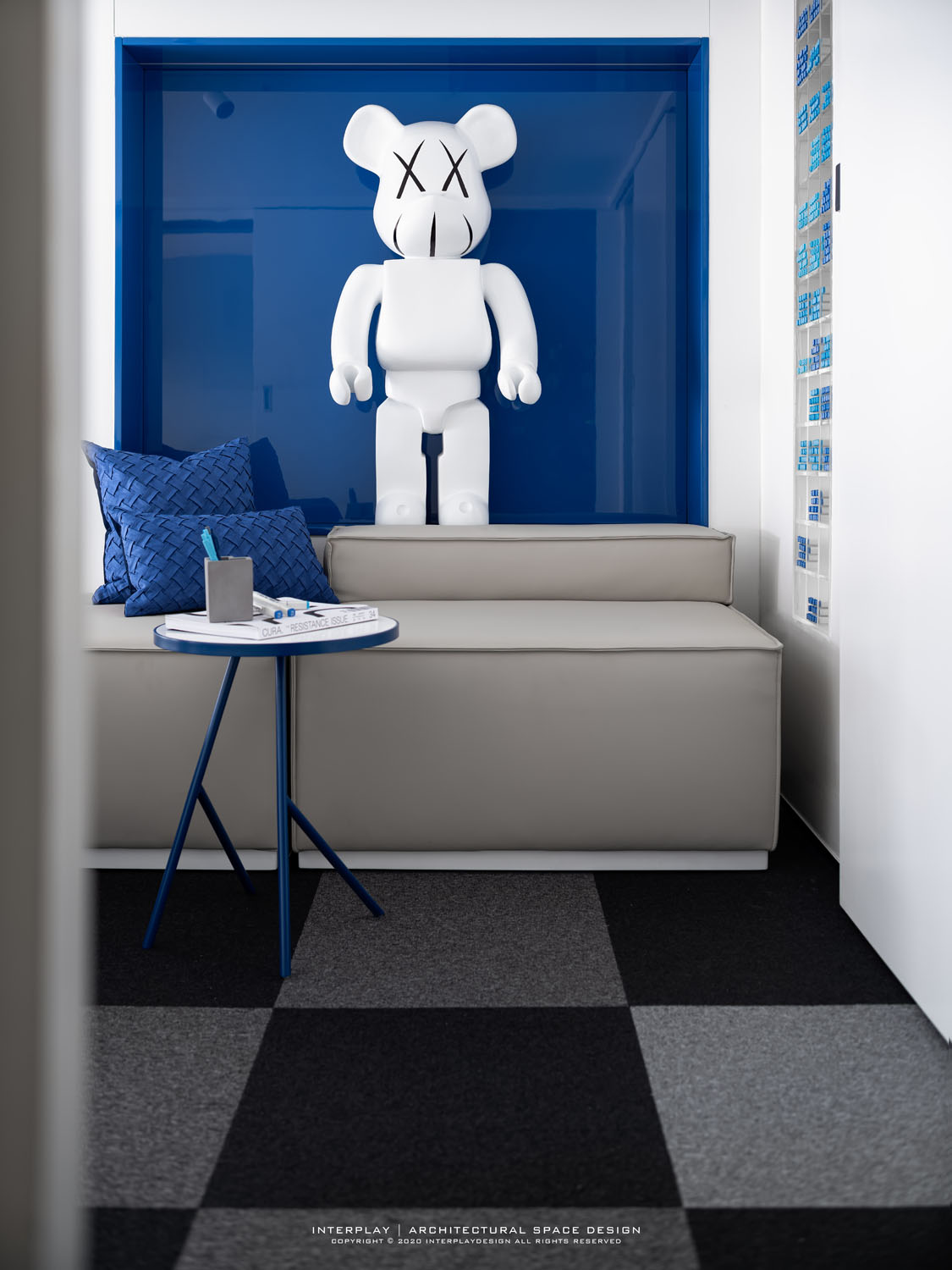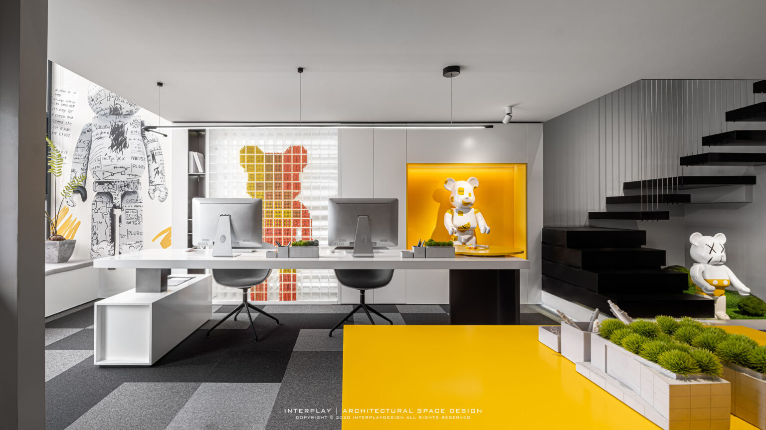 色彩配置大膽直接,亮黃與寶藍的撞色搭配灰黑棋盤格地毯,讓空間化身為一座潮玩藝廊。