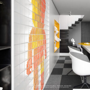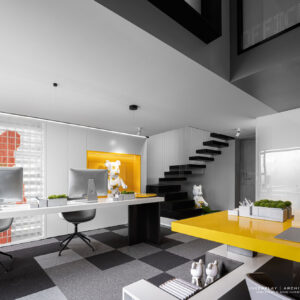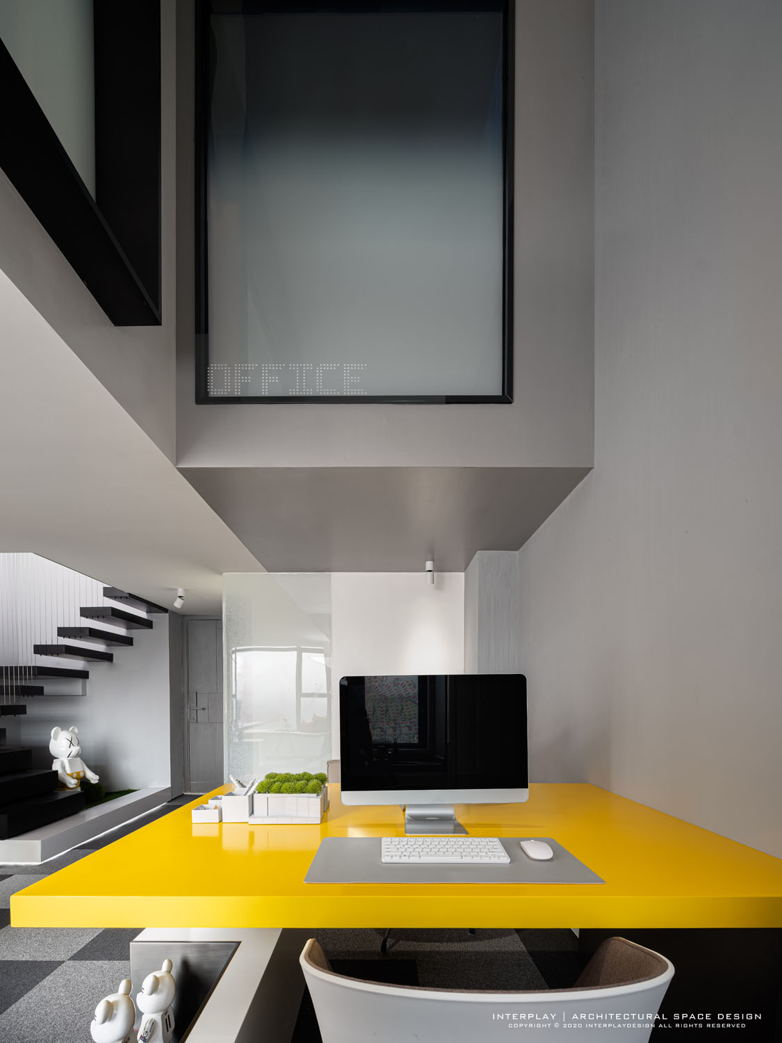 這是演拓設計與中國設計團隊在廣州朗信國際共同打造的實品屋,專為 SOHO 族定義的複層基地。我們打破居家與辦公的硬性界線,採取「下辦公、上起居」的配置,將下層轉化為充滿張力的創意基地。