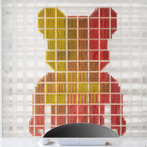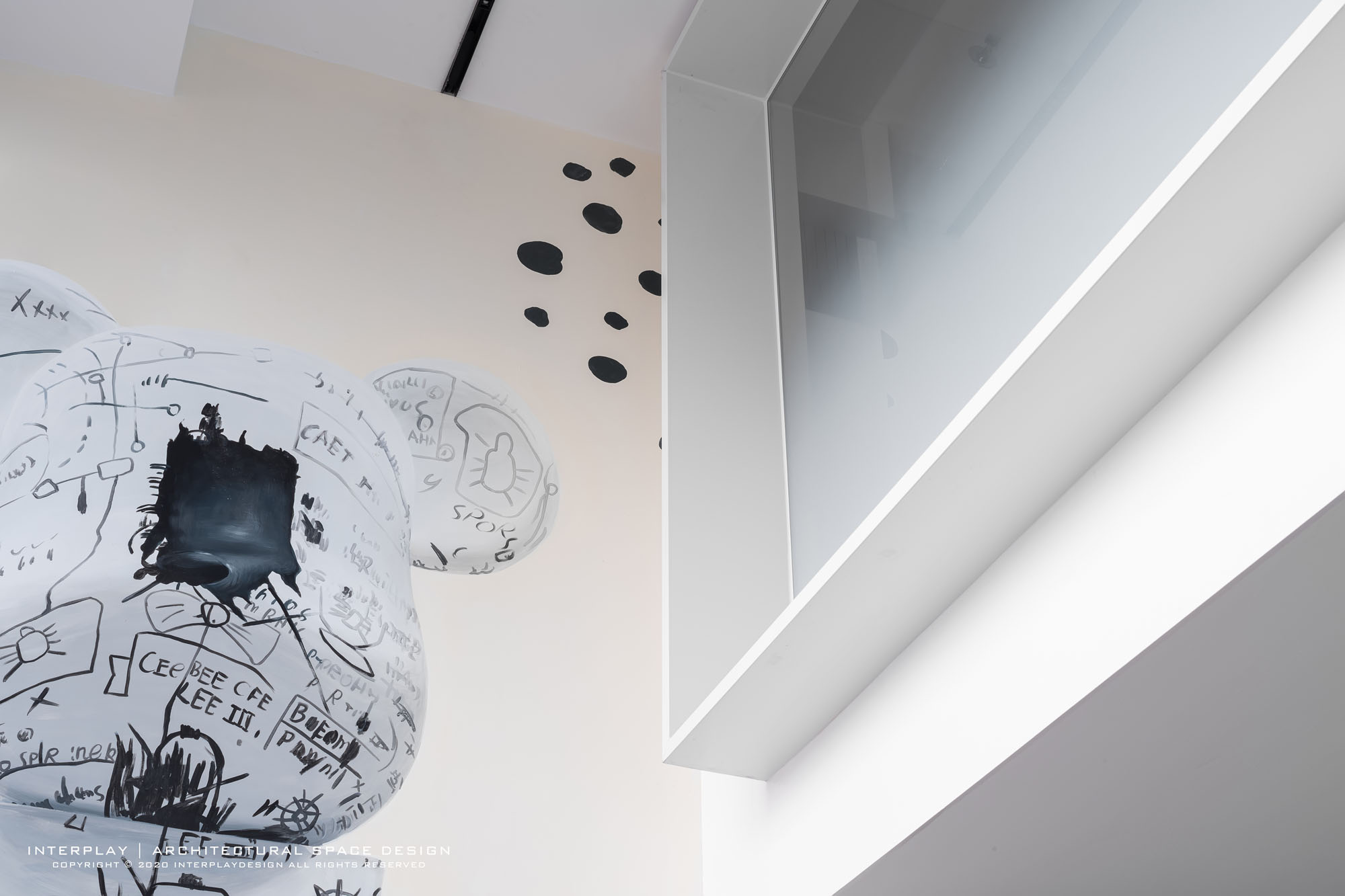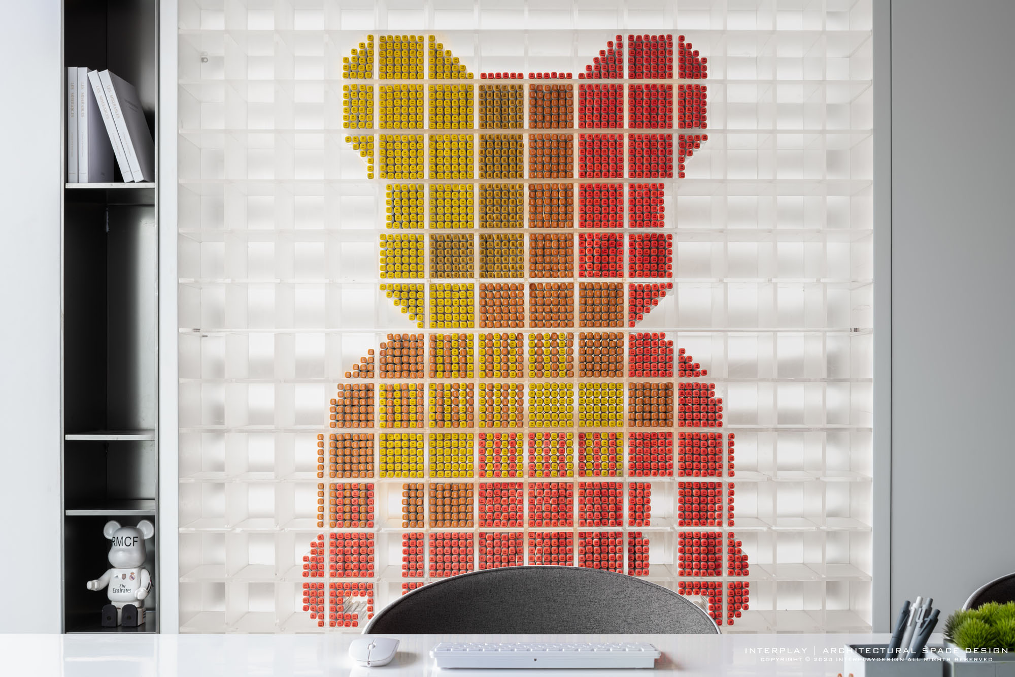 空間視覺的核心,是那面由數千支麥克筆拼成的藝術牆,一筆一顏色堆疊出熊的輪廓,讓牆面的藝術張力擴大。