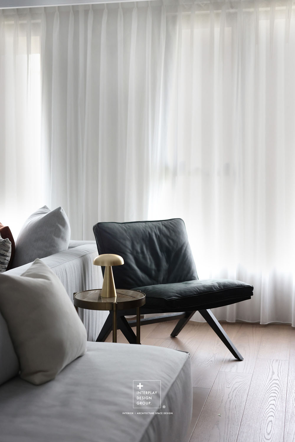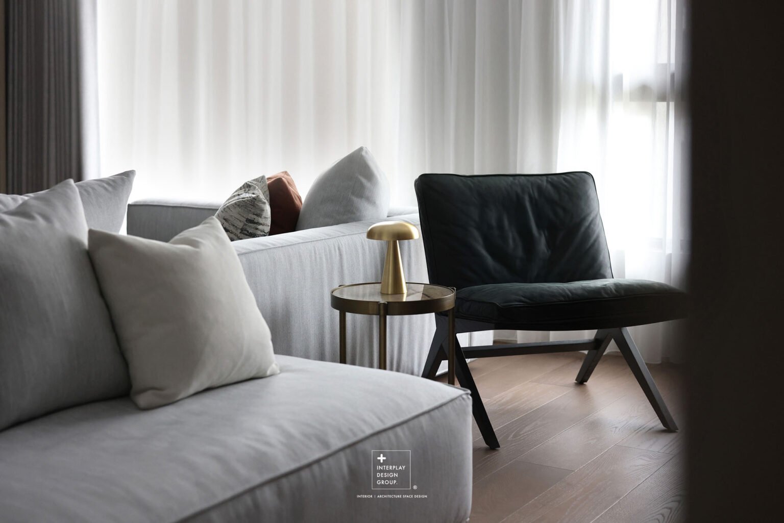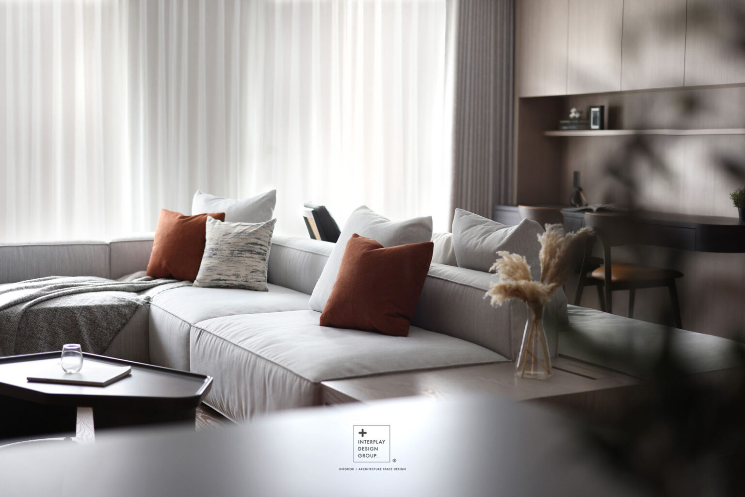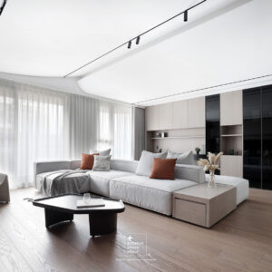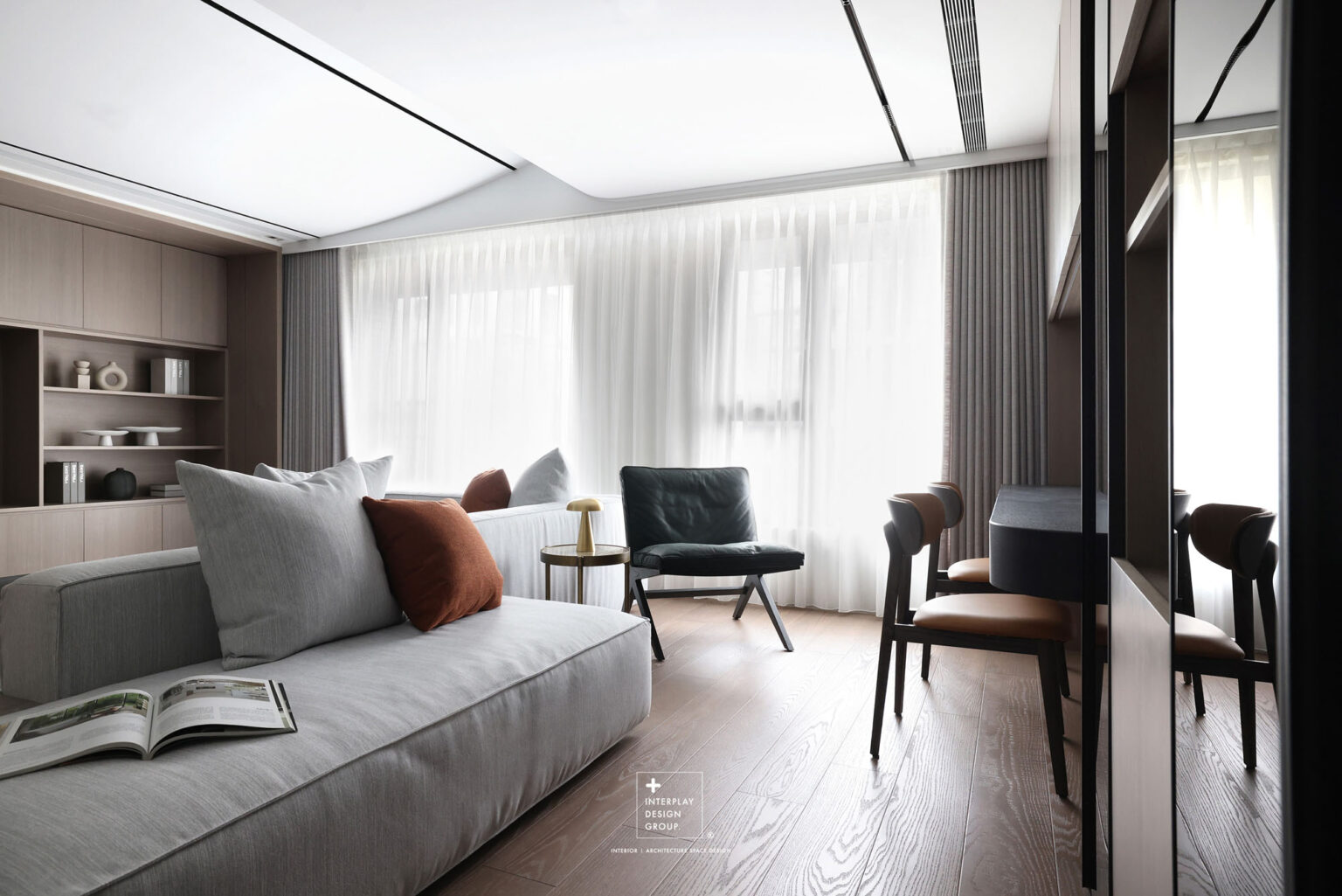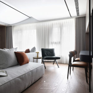 本案座落於內湖區《華固馥儷》,在 60 坪的空間尺度下,我們以大地色系與極致灰調為基底,將空間想像為畫布的留白,將生活的喧囂過濾,保留大面積採光,透過設計將窗簾映出的光影隨時分推移,與牆面交織出如律動般的層次,也讓空間有了呼吸的頻率,也讓光成為家中不可或缺的設計語彙。