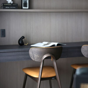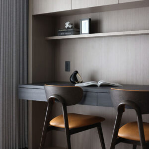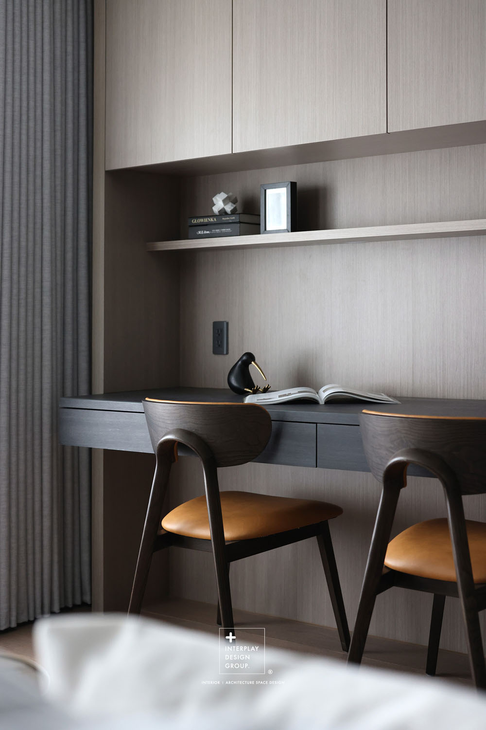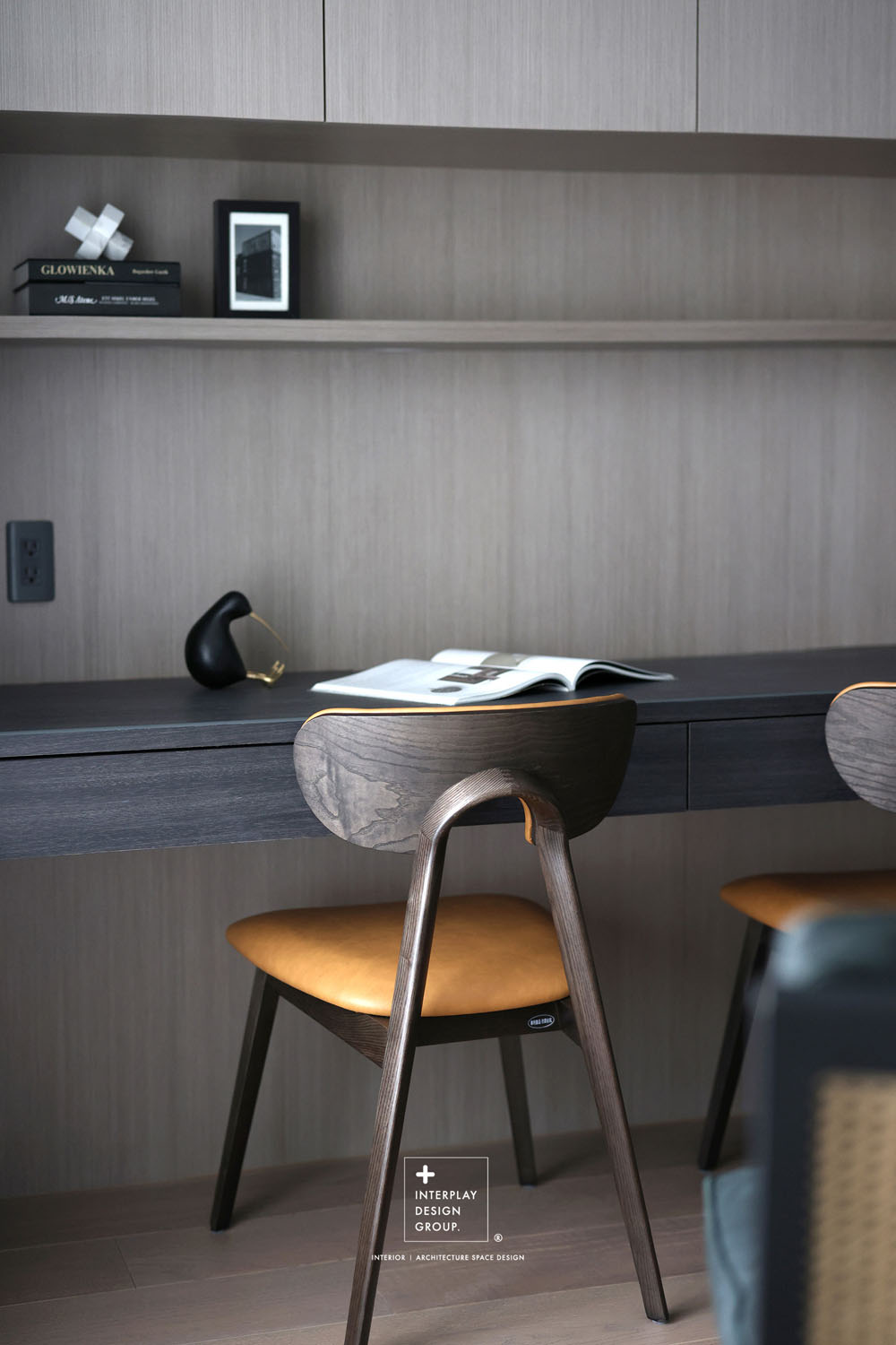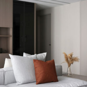 在低語的灰色調中,材質的對比成了空間的對話,石材肌理與細膩牆面交疊,在視覺留下空白的同時也讓指尖觸碰時勾勒出層次分明的溫度,搭配軟裝中的一抹橙色點綴,在冷靜的理性基調中注入感性的悸動,也讓灰階底圖上映照出溫暖的歸屬感。